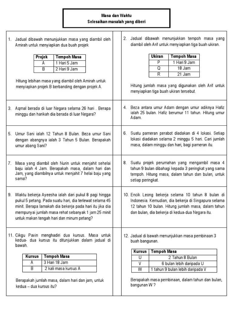 Masa Dan Waktu Tahun 6 - Interactive Worksheets By Hamirudin. Video ini merupakan penerangan bagi unit masa & waktu bagi silibus matematik tahun 6. Matematik tahun 6 unit 6 : You can do the exercises online or download the worksheet as pdf. Nyatakan waktu tersebut dalam sistem 24 jam. Jam 0000 = pukul 12:00 a.m. . Ia merangkumi subtopik tempoh masa (jam & minit).